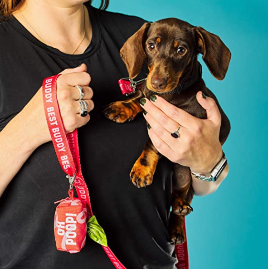 Funny holder for dog bag bags! A nice case that can easily be hung in e.g. the leash. Bags included.