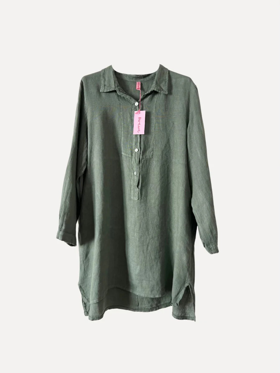 Härlig linnetunika med skjortkrage, halvknäpp och hellång ärm. bär tillsammans med ett par byxor eller shorts!